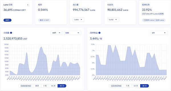 根據Terra儀表盤數據顯示,目前LUNA的全網質押率為33.92%,實時質押年化 5.44%。