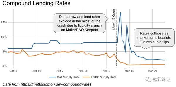 與此同時,Dai的交易溢價更高,直到2020年4月6日,其交易溢價依然存在。這是Dai生態系統背后一些更深層次機制直接導致的,其中包括未能保持其清算引擎平穩運行,導致MKR代幣產生400萬美元的資本損失。(藍狐筆記:可以參考藍狐筆記之前的發布的文章《Maker“黑色星期四”復盤:深挖時間線剝離每一層》)