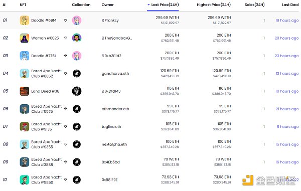 24小時內銷售價格前十的NFT 數據來源:NFTGO