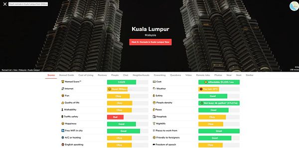 宜居程度得分:馬來西亞首都吉隆坡的宜居程度得分為3.52 分。吉隆坡是一個生活成本極其低廉的城市,它有著很棒的工作環境,但缺點是夜生活很一般,初創公司也很少。