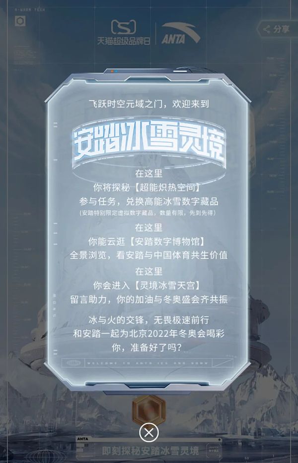 基于以上這些,我能想到的最近的一個例子,就是在天貓超級品牌日,安踏所推出的“安踏冰雪靈境”虛擬數字空間。