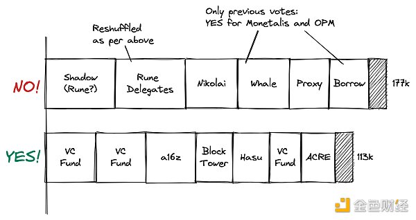 從內部者@g_dip 的視角來看,這無異于一場「勾心斗角」式的黨政洗牌。社交媒體用“大衛林奇級別的荒謬”(David Lynch level absurdity)描述著整件事;首先是 Rune 作為 LOVE 的反對領頭羊拉攏了自己的隊內人@hasu 和 @ElProgreso 一起投出了反對票。當機構巨鯨如 a16z through Porter Smith,Kevin Miao 和 Kianga Daverington 公開表示支持后,在 Maker 的 discord 頻道中開始出現了匿名者們對 VC 行業的「吐槽」。但反對的勢頭仍然微弱,并未能戰勝贊成票的比重。曾被排擠出局的 Nikolai 突然殺回了 Maker 的論壇上開始反對 LOVE-001。在 Nikolai 動員的投票中,其中一筆投票 $MKR 被發現來自于 Aave 的 9 千美元借貸。