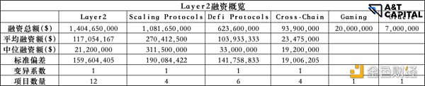 總體數量太少,不具有統計意義。總體來說,Layer 1 & Layer 2 屬于融資額度高,賽道火熱。按照技術流分項目的話,融資額度相差不大。