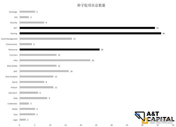 由圖可見,種子輪融資項目數量前三類別:游戲、NFT、元宇宙。種子輪融資金額前三類別:交易所、中心化交易所、安全。