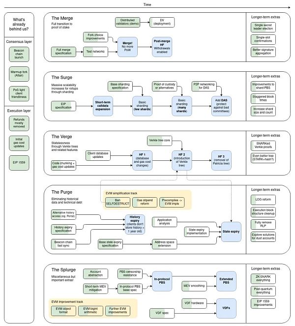 眾所周知,The Merge是關于從PoW轉換為PoS,Beacon Chain和原以太坊主鏈合并。The Merge之外,以太坊其實還同時并行推進著The Surge、The Verge、The Purge、The Splurge。這些升級的推出順序尚不確定,因為它們是相互獨立、平行進行的。