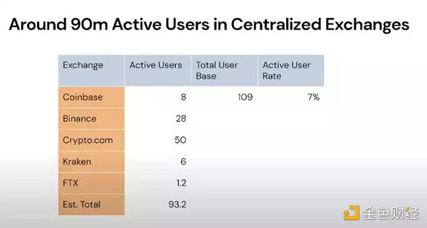 2)CEX 活躍用戶約 90M,其中 http://Crypto.com 最高。過去,大戶一般在 DEX 上交易,而散戶則一般集中在 CEX。而隨著機構進入 CEX,兩者的用戶分布開始趨同。