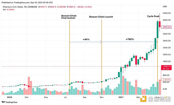 就背景而言,合并早在今年 6 月初就開始進行測試。在 Sepolia 進行第二次大型測試后,ETH 從 6 月初的 800 美元底部大幅反彈,隨著主網合并日期在 8 月確定,它幾乎達到了 2000 美元。