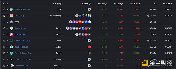 DeFi項目鎖定資產前十排名及鎖倉量 數據來源:defillama