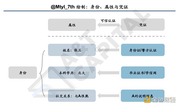 因此我們可以看到,一個身份,是由許多個屬性組成的,例如剛才張三對自己的陳述中,所涉及的姓名、出生年、學歷、社交圈等屬性。但是,如果沒有相應具體的憑證,這些屬性是沒有可信度的,而多數應用場景不會去采納一個沒有可信度的數字身份。由于在Web3中,一個身份的屬性來源更加多樣、潛在使用方更加廣闊,難以找到一個中心化的總擔保方,因此對每個屬性的憑證驗證就顯得更加突出。