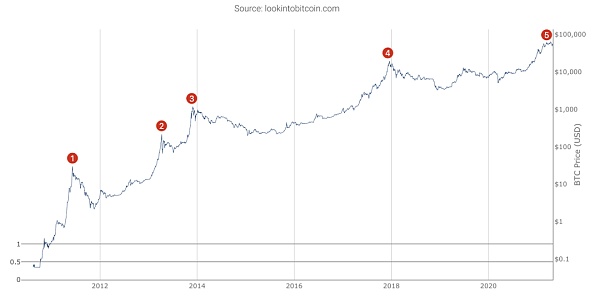 根據CaseBitcoin的數據,比特幣的10年年均復合增長率(CAGR)為196.7%。該指標將復利納入考量范疇,衡量資產的年增長率。比特幣出現過四次重要的價格高峰,從2011年的1美元上漲到2021年5月的6.5萬美元,創下歷史新高。縱觀比特幣的發展史,我們將其分解為五段不同的高峰。