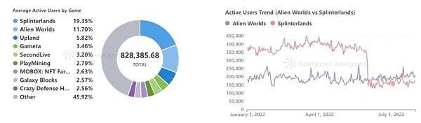 目前 GameFi 活躍用戶主要集中在 Splinterlands 和 Alien Worlds 和這兩個項目中,活躍游戲用戶的分布相對分散,這也意味著目前該賽道并沒有項目真正能夠實現“一騎絕塵”,競爭并沒有十分激烈,尚處于藍海開拓期,發展空間與資源相對充足。