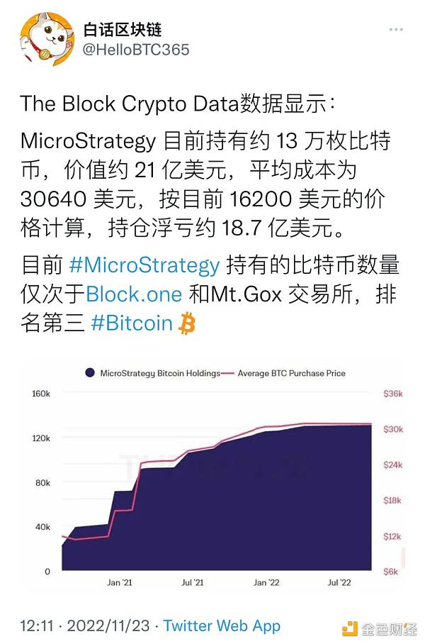 根據本月初其披露的第三季度財報,MicroStrategy 目前持有約 13 萬枚比特幣(約占流通中比特幣總量的 0.615%),價值約 21 億美元,平均成本為 30640 美元,按目前 16200 美元的價格計算,持倉浮虧約 18.7 億美元。