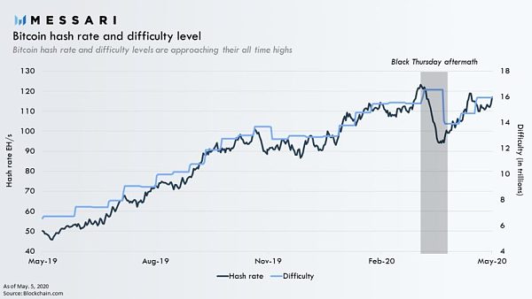 根據區塊鏈研究和數據平臺Messari數據顯示,在連續第三次上調難度調整之后,比特幣的難度水平接近歷史最高水平。自比特幣近期價格回升以來,哈希率自黑色星期四觸及低點以來上漲了25%。