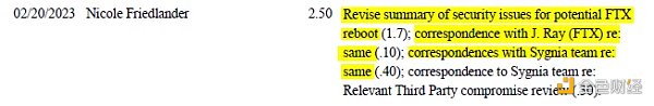 這里補充一個小插曲,之所以能在財務細節中看到這些討論,是因為 FTX 與律師團隊的這些討論需要按時長付咨詢費,而 Sullivan Cromwel 二月份從 FTX 處獲得的費用收入高達 1350 萬美元。