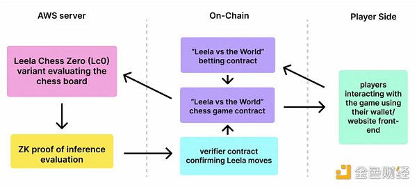 說到 on-chain AI,這次 modulus lab 部署了一個更大的 deep neural network (Parameter 數量 > 3,700,000)。雖然在模型規模和產品內容上 Leela 都超越了 rockefeller,但歸根結底這還是一次大型的 on-chain AI experiment。Leela 的背后的機制和運行模式才是需要關注的,這能幫我們更好地理解鏈上 AI 的運行模式和改善空間,以下是官方給出的邏輯圖: