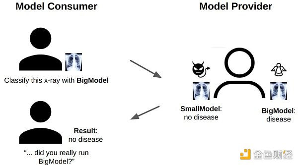 ML-as-a-service:這目前還只是一個思考方向,沒有具體的落地應用,但目的是通過 ZKP 解決中心化 ML 服務提供者作惡以及用戶信任的問題。Daniel Kang 在文章“Trustless Verification of Machine Learning”中有詳細的描述(參考文中的一張圖)