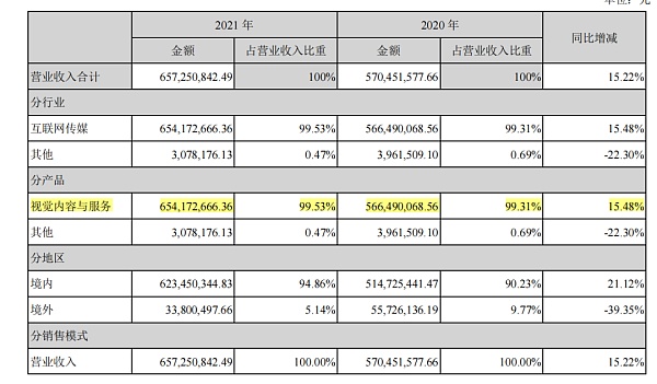 2021年,來自視覺內容與服務層面的營收達6.5億余元,占到了視覺中國總營收的99.53%,較上一年同比增長15.48%。視覺中國表示,該公司目前提供4億張圖片、3000萬條視頻和35萬首音樂等可銷售的版權內容。其中,機構供應商提供的內容占比達60%,簽約供稿人提供的內容占比達30%,自有版權內容約占10%。