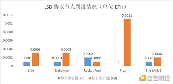 節點運營商是質押收益的基礎,節點運營商的表現將直接影響到 LSD 協議的 APR,以下是主要 LSD 協議節點運營商的表現,各個協議節點運營商的 APR 絕對差距不大,節點運營商之間的差異不明顯。相對來看,Lido 的 APR 保持第一,底層節點運營商表現領先市場;而眾包模式的 Rocket Pool 罰沒較多,APR 相對較低;Ankr 的 APR 表現最差。