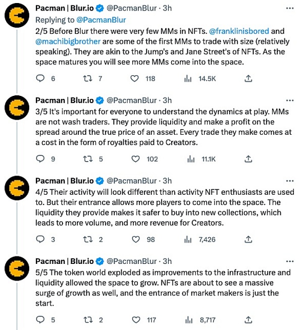 Pacman覺得傳統市場和代幣市場的絕大部分交易量來自少數做市商(MM)。在Blur之前,NFT中的MM非常少,隨著這個市場的成熟,你會看到更多的MM進入這個市場。MM提供了流動性并從資產真實價格的價差中獲利,他們進行的每筆交易都以支付給創作者的版稅形式出現,為創造者帶來更多收入。
