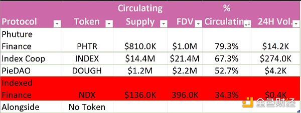 他們的代幣市值、交易量證明了我們在鏈上指數方面是多么早期。除了 Index Coop 的 INDEX 之外,它們都是小市值的代幣,交易量極低。