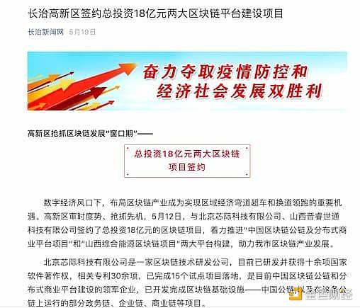 也就是說,在 6 月份合作的 5000 萬「長治公鏈項目」之前,北京芯際與「晉睿世通」兩家公司共同承接過總投資額高達 18 億元的兩大區塊鏈平臺建設項目。此前的一系列會談和合作表明,芯際科技與山西長治市政府已在區塊鏈領域建立深度聯系,芯際科技已然成為長治高新區區塊鏈產業生態構建中的重要角色。