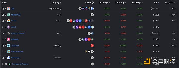 DeFi項目鎖定資產前十排名及鎖倉量 數據來源:defillama