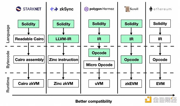 相比之下,ZK 式擴展的特性使得 ZK rollups 從定制的 VM 開始,這意味著項目因此需要更廣泛的工作來“解釋”來自 EVM 的代碼或使用從頭開始編寫的新代碼。不過,截至 2023 年 3 月,多個 ZK rollups 項目現在明顯即將公布他們自己的 zkEVM 實現!