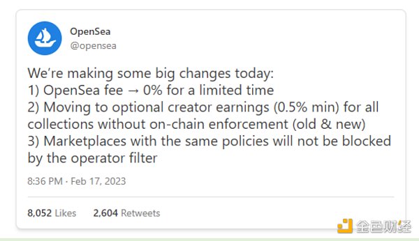 在48小時之內,OpenSea發表了一份前所未有的聲明,宣布撤銷其“支持創作者”的版稅征收政策,并暫時將市場交易費降至零。