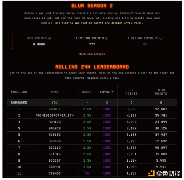 Blur的空投是圍繞“忠誠度積分”系統設計的,該系統根據用戶在其市場上的競價數量獎勵積分。你的競價越高,這些競價就越接近藏品的底價,你獲得的忠誠度積分就越多,最終空投的金額也就越大。