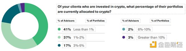 在客戶賬戶中配置加密貨幣的顧問中,絕大多數 (95%) 在客戶投資組合中持有加密貨幣的權重為 5% 或更低。
