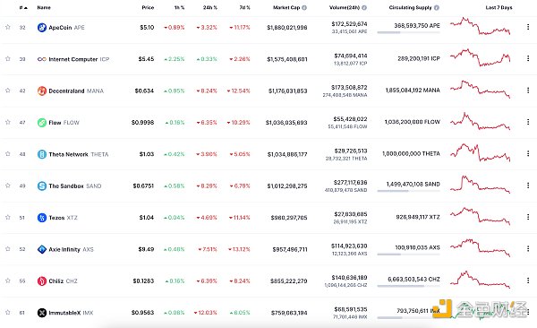NFT總市值、市值排名前十項目 數據來源:Coinmarketcap