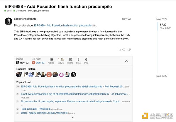并且,EIP-5988 此次使用的是 Poseidon 哈希算法,將會作為各類L2統一預編譯的生成證明方式,這也是首次可能兼容進以太坊的新算法,而此前主要在各類L2中嘗試使用,但安全性尚未得到主流應用大規模長時間檢驗,這也是 EIP-5988 引發的主要爭議點。