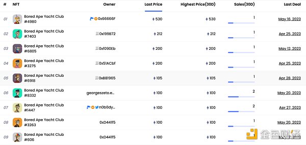 在過去的 30 天里,賣出的最貴的 BAYC 是#4980 ,以高達 530 ETH 的價格成交。這只猿的主人是 0x 66666 F,是一名投資組合價值為 743.91 ETH 的鯨魚。在#4980 之后,下一個最昂貴的 BAYC 是#7403 和#6805 。