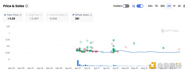 根據 NFTGo 數據,本月的交易量峰值出現在 5 月 2 日,其次是 5 月 10 日,每日交易量約為 50 筆,而在 5 月 20 日達到最低點。
