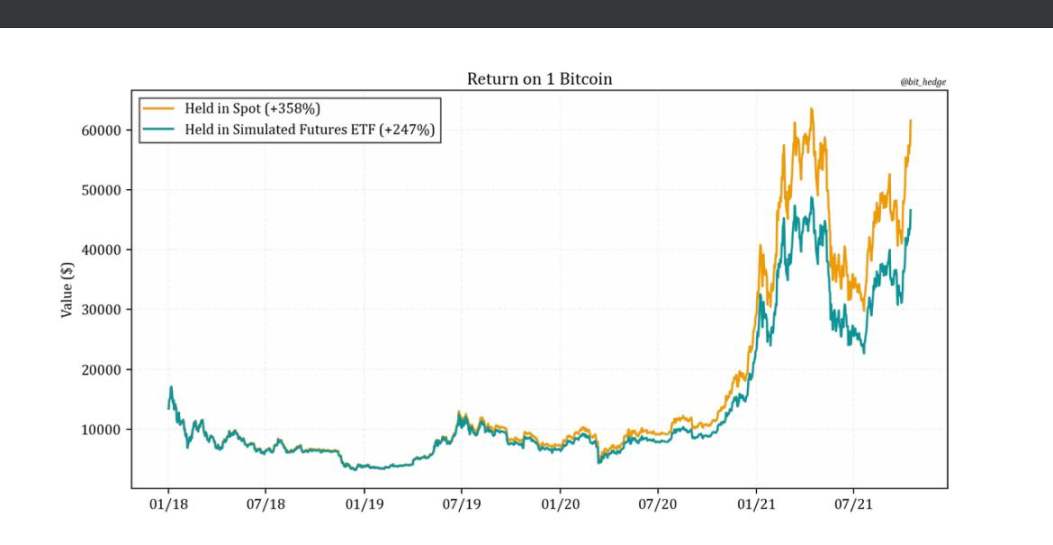 bithedge 模擬了從 2018 年到 2021 年滾動持有比特幣期貨 ETF 的成本,結果是該時間段內與持有現貨相比損失 25%。