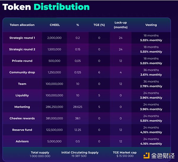 1、CHEEL:治理代幣,發行總量為1,000,000,000枚。通過這一治理Token,社區可以根據 DAO 原則對平臺發展的重要問題進行投票達到有效治理的目的。