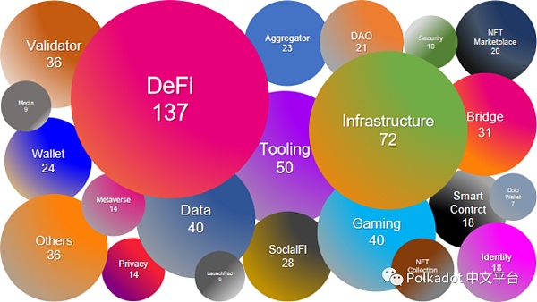 鏈接 Polkadot 和 Kusama(簡稱“Dotsama”)中繼鏈的平行鏈有 82 條,近 560 個項目部署在 DeFi、基礎設施、NFT 市場、游戲、社交平臺等賽道,數量正在穩步增長。