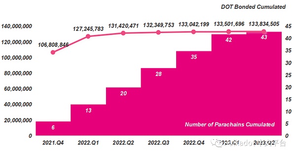 Polkadot 已成功完成 44 平行鏈插槽拍賣,目前擁有 43 條平行鏈,累計鎖定超過 1.33 億個 DOT(約占總供應量的 10%,價值近 5.8 億美元) 。