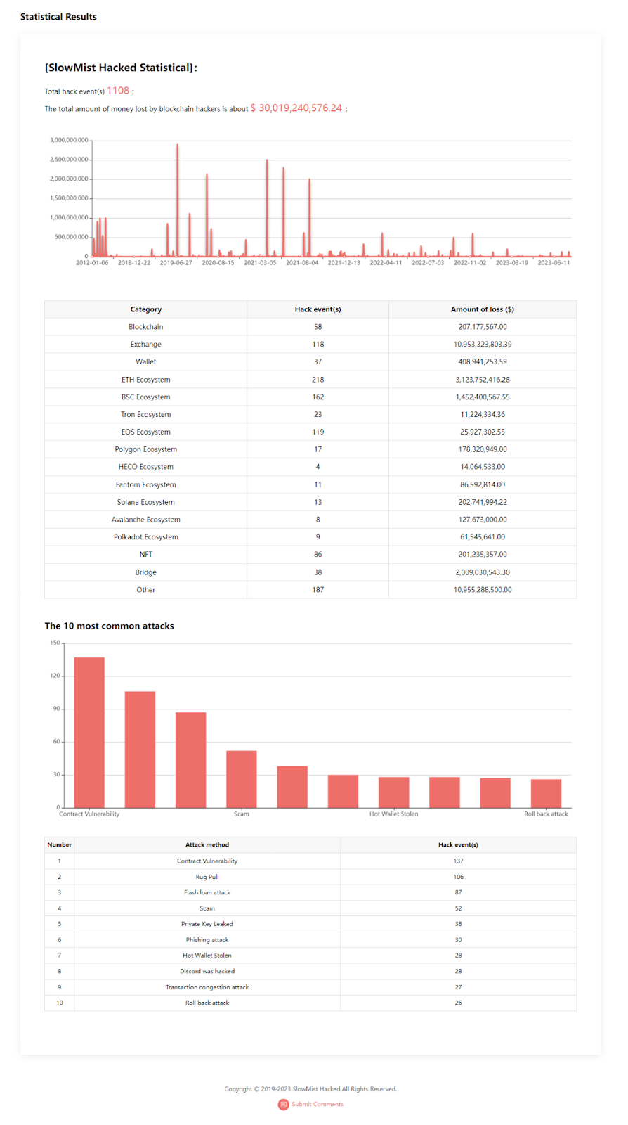 圖源:live shooting黑暗叢林與光明騎士據慢霧 Hacked.slowmist 的最新統計數據,從 2012 年 1 月 截止 2023 年 7 月 14 日,區塊鏈領域因黑客攻擊而導致的損失總金額已超過 300 億美元,總黑客攻擊事件為 1108 次!