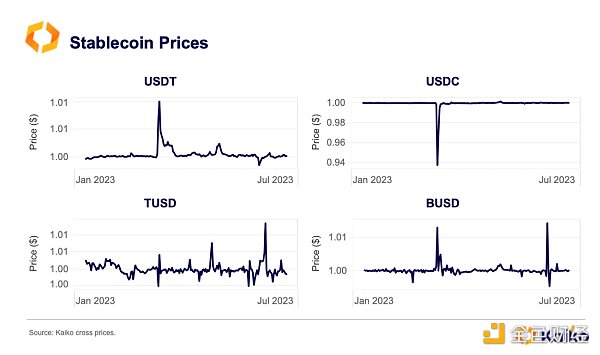 穩定幣在加密貨幣市場中具有系統重要性,因此即使是最輕微的脫鉤也會導致大規模市場蔓延。因此,自 2023 年初以來,穩定幣的波動性尤其令人擔憂:TUSD在 Prime Trust 關閉期間出現波動,USDT 由于神秘的拋售活動而脫鉤,自 Paxos 停止發行以來,BUSD 的波動性越來越大,而 USDC 在 3 月份的銀行危機期間驚險脫錨。