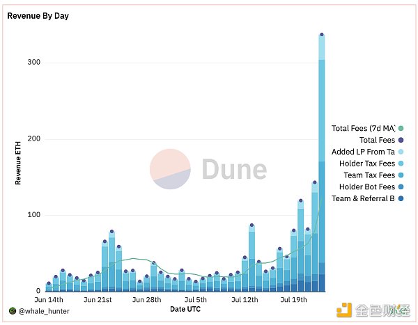 從 Dune 的數據可知,機器人交易費用也呈上升趨勢,7 月 23 日的費用是前一天費用的 1.65 倍,但增長速度不如 $UNIBOT 的稅收。