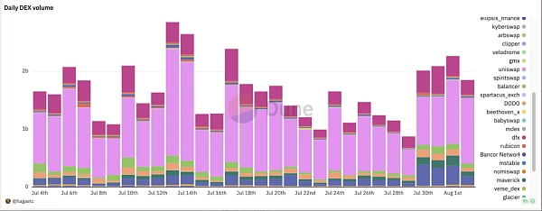 據 Dune 數據顯示,在 Curve 之后,各個 DEX 交易量甚至在小幅回升,以太坊的交易量仍占 66.5 % 的主流份額,日交易額穩定在 10 億美元左右。