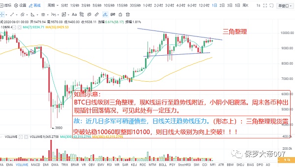 如圖示意。比特幣日線級別三角整理,現K線運行至趨勢線附近,小陰小陽震蕩。周末各幣種出現插針回落情況,可見此處有一定壓力。
