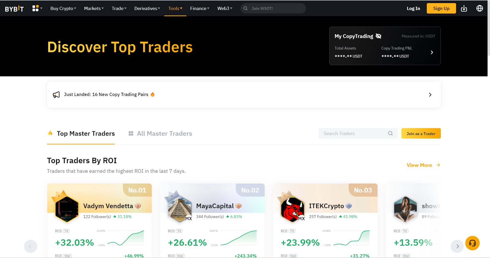 第二種則是各大交易所跟單產品,典型例子為 Bitget 和 Bybit。當用戶達到特定條件(通常是收益業績和關注人數)時可以通過申請成為帶單達人。帶單達人選擇展示自己的倉位,吸引其他用戶進行跟單,并分享10%左右的跟隨者的凈收益。