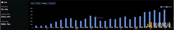 此外,與其他區塊鏈應用相比,這種收入流的質量更高,因為它具有重復性。例如,去中心化交易所(DEX)的收入具有周期性,并且高度依賴市場環境。一般來說,在牛市期間,DEX 的交易量較大,在熊市期間則逐漸減少。這導致協議層面的收入來源不穩定。不幸的是,這也是許多其他區塊鏈應用的情況——NFT 市場在 NFT 熊市期間收入下降,貨幣市場的收入隨著對杠桿需求的減少而下降。因此,我們認為,在一個波動和反應迅速的市場中,流動性質押賽道的穩定收入來源是一個常常被忽視的優勢。