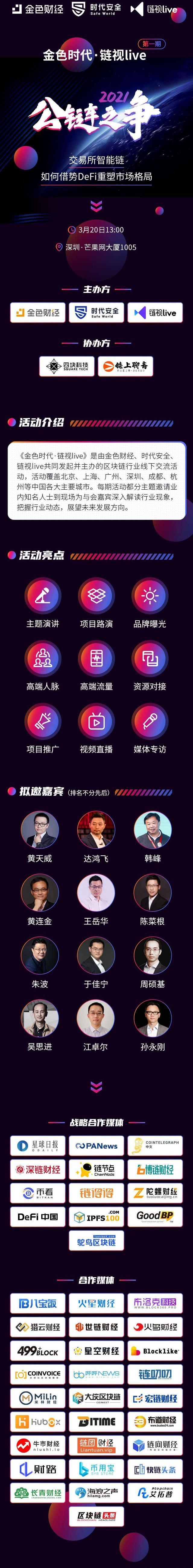 由金色財經、時代安全、鏈視live聯合主辦的《金色時代·鏈視live》第一期“2021公鏈之爭,交易所智能鏈如何借勢DeFi重塑市場格局”將于2021年3月20日14:00在深圳南山軟件基地芒果網大廈1005舉辦。