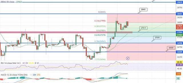 只要比特幣保持在27,500美元上方,就很有可能進一步上行,下一個阻力位預計在27,998美元左右。