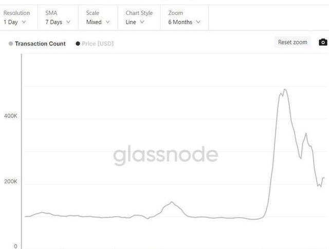 根據Glassnode提供的數據,日交易量的7天移動平均數在5月14日創下近500,000的歷史新高,然后在周三回落至220,000左右,仍然是2023年初水平的兩倍。