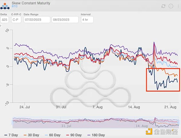 我所依賴的指標是d25偏差。它基本上需要兩個與比特幣當前價格相差相似的期權合約(d25 = 0.25 delta和0.75 delta合約)。這個指標對兩者進行了比較。如果這個數字是負數,那么它暗示了情緒過于消極。