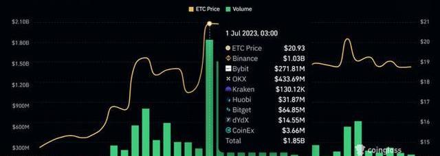 據Coinglass稱,期貨市場的ETC交易量大幅減少。從長遠來看,7月1日ETC交易價格為20.93美元時,該指標為18.5億美元。